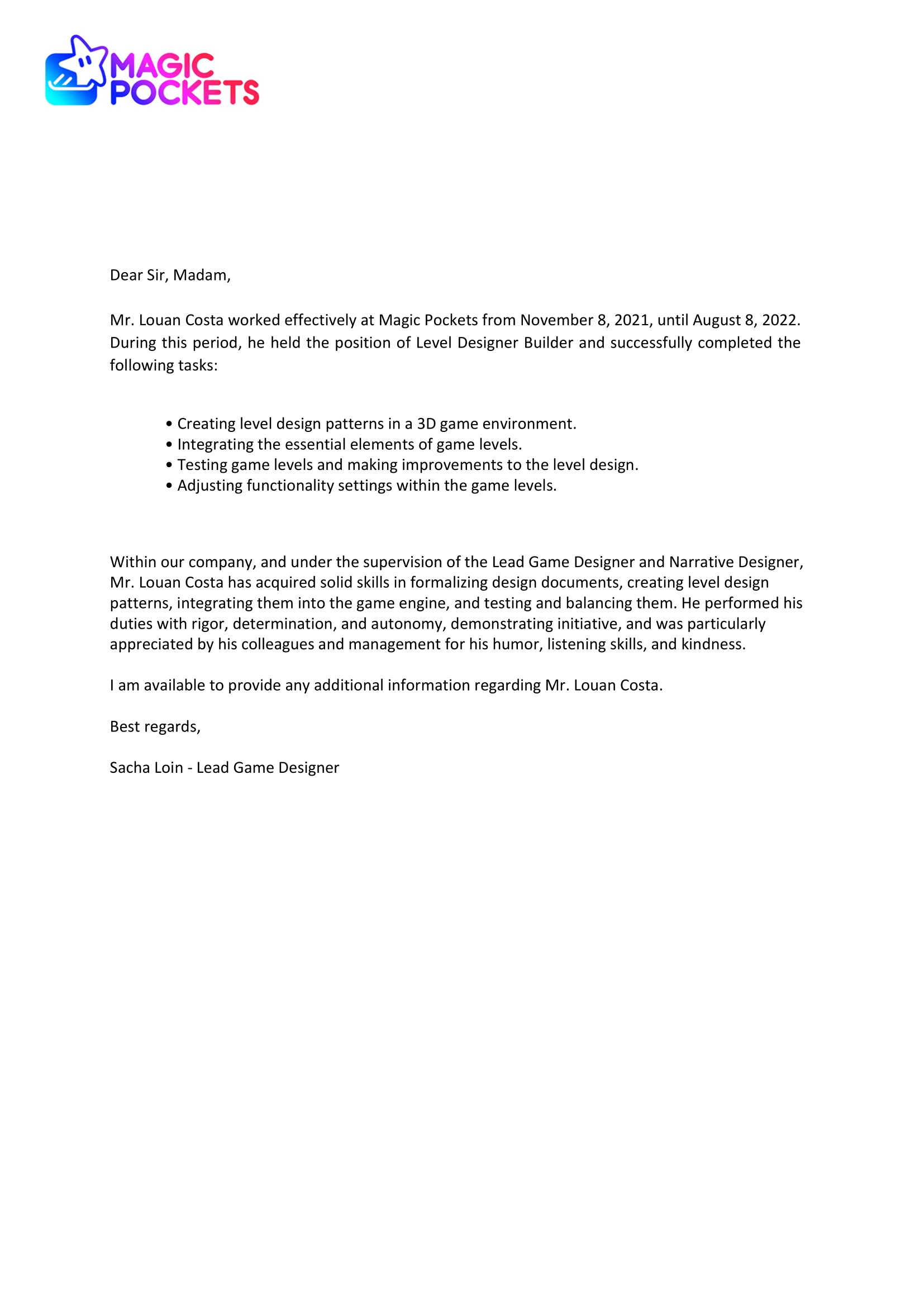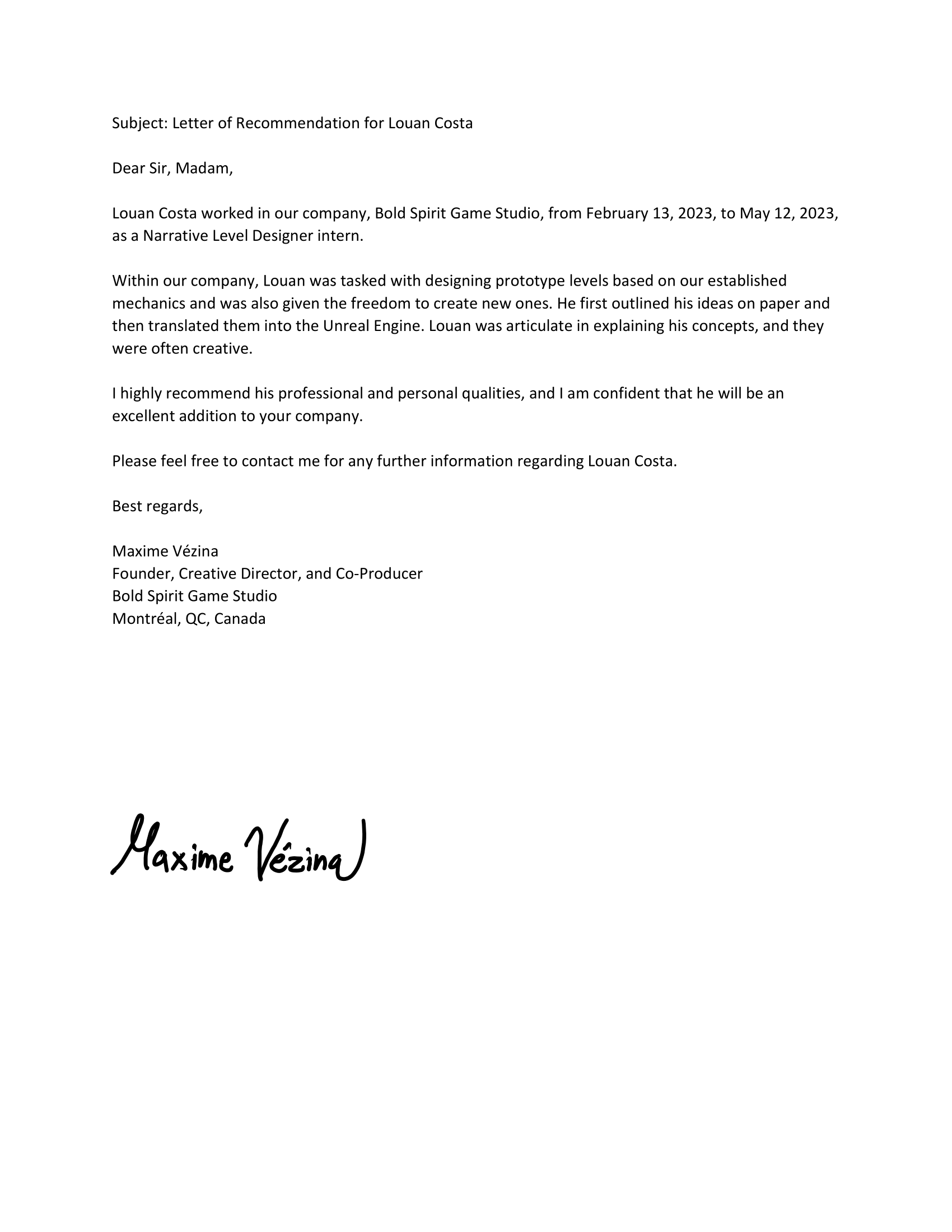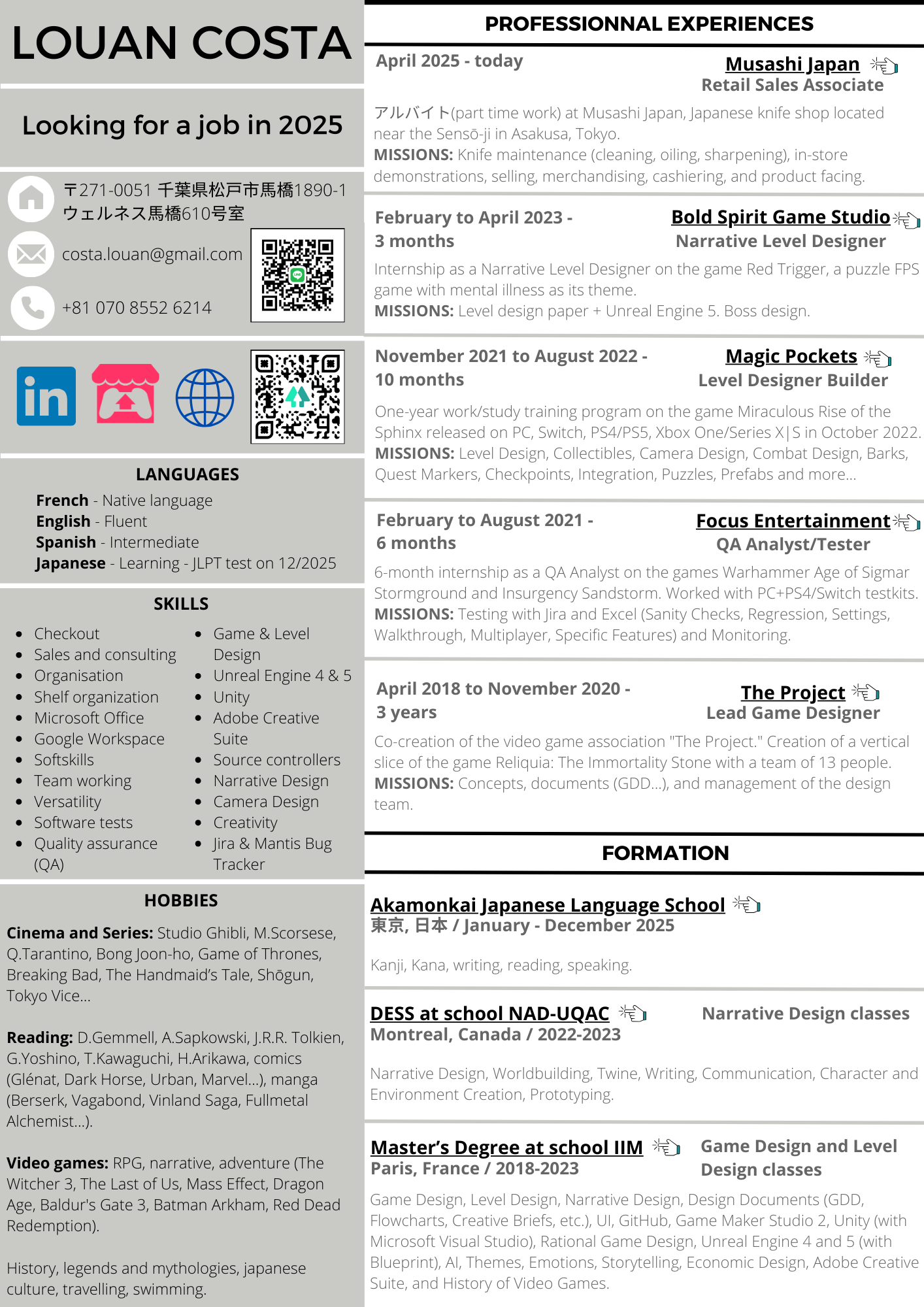 Having studied Game Design and Level Design for 4 years at the school IIM in Paris, France and Narrative Design for 1 year at the school NAD-UQAC at Montréal, Canada.